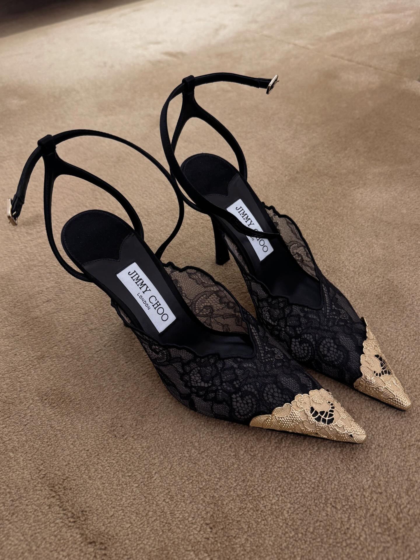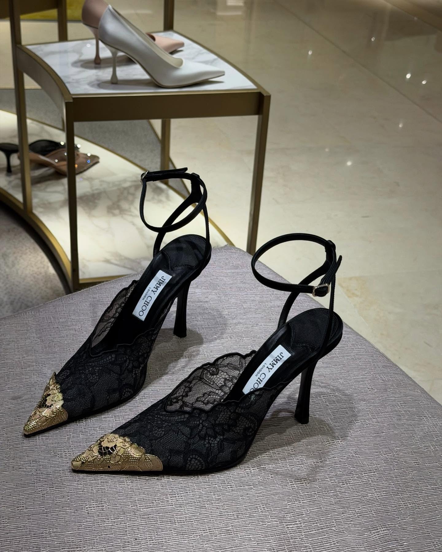 Riječ je o modelu Faiz 100 – crne cipele s visokom potpeticom s čipkastim i zlatnim detaljem. Izrađene su od Jimmy Choo čipke u crnoj nijansi sa kontrastnim zlatnim detaljem na vrhu cipele koji je izrađen od metala. Visina potpetice je 10 centimetara, a cipele krasi i tanki remenčić oko gležnja.