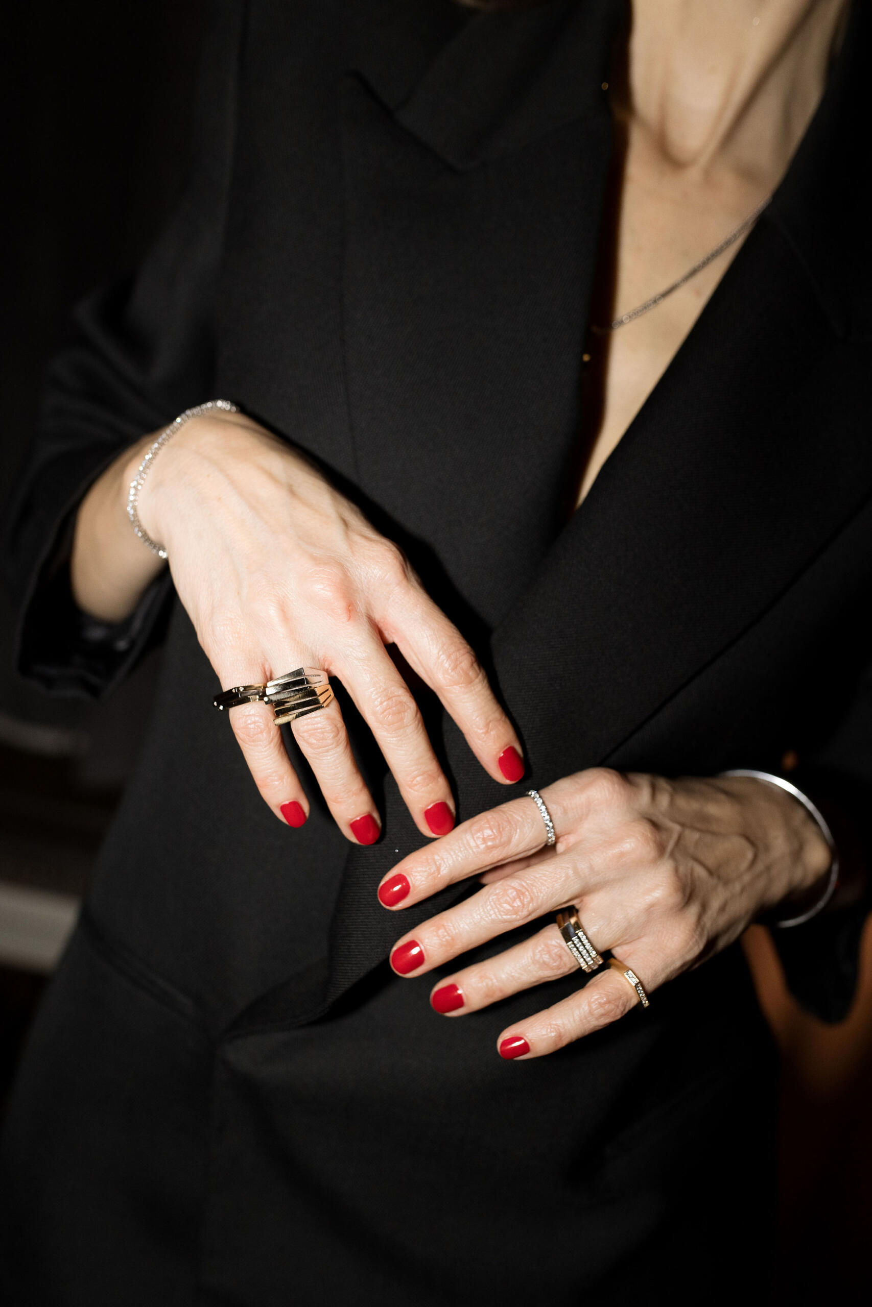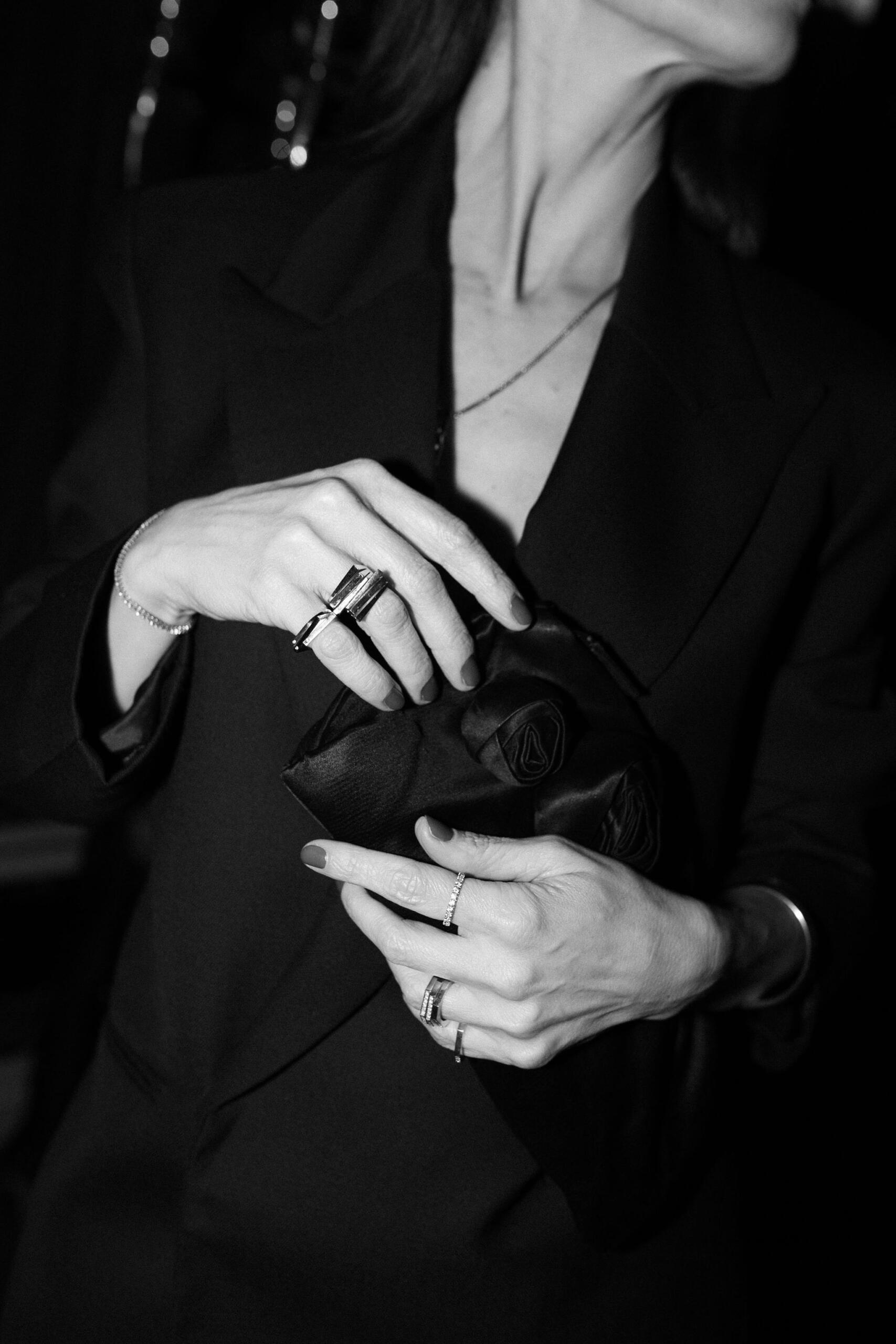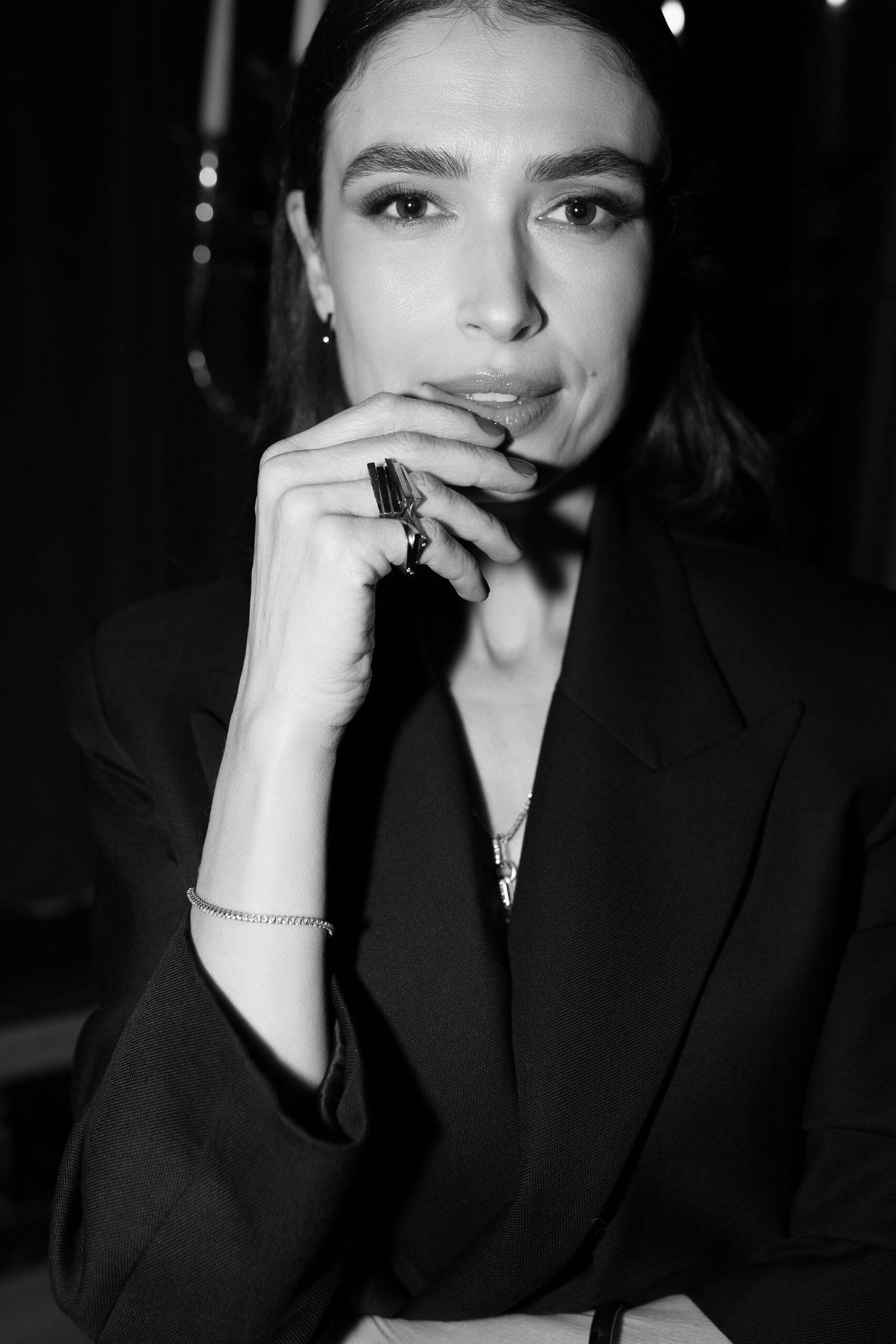 Ambasadorica brenda za ovu prigodu odabrala je ogrlicu i prsten EVA, s geomtrijskom motivima, koji unose dozu odvažnosti i profinjenosti u svaki outfit. Ovaj prsten i ogrlica, izrađeni od 18-karatnog zlata s pavé dijamantima, donijeli su savršen balans između diskretnog sjaja – koji je vidljiv pri svakom pokretu – i upečatljivog izgleda. Osim toga, ovo je prstenje idealno za stacking, što je savršeno pokazala i manekenka, što je savršena prilika za kreirati personalizirani look.
