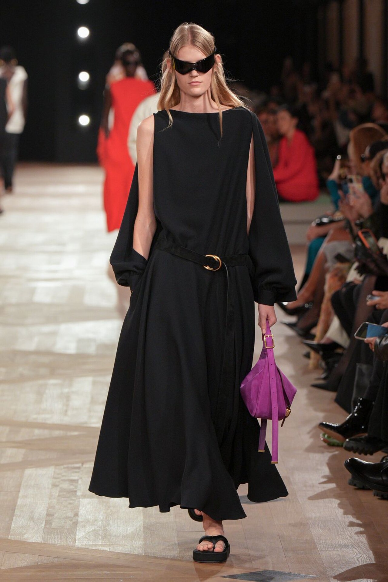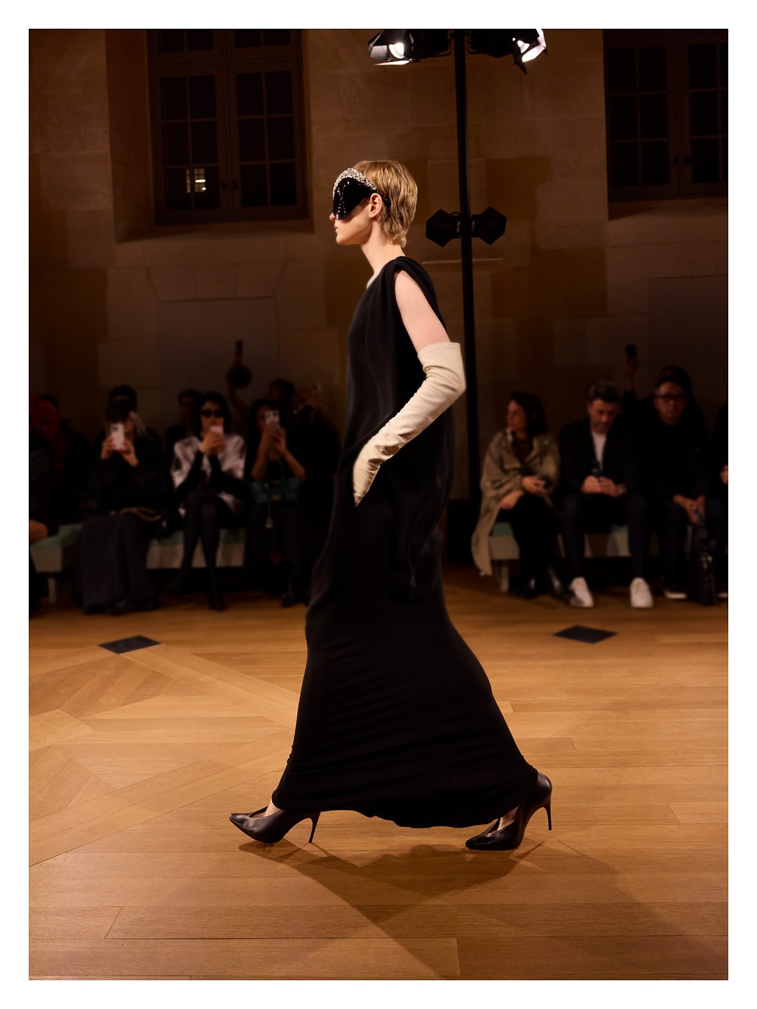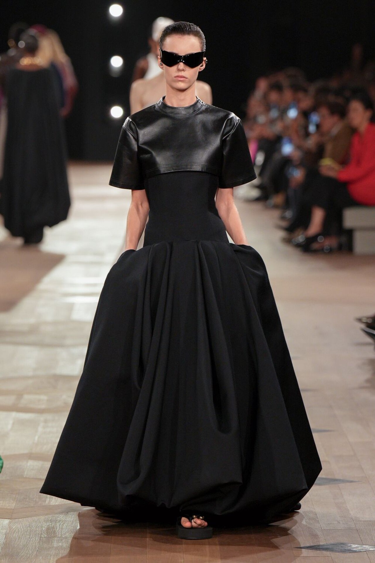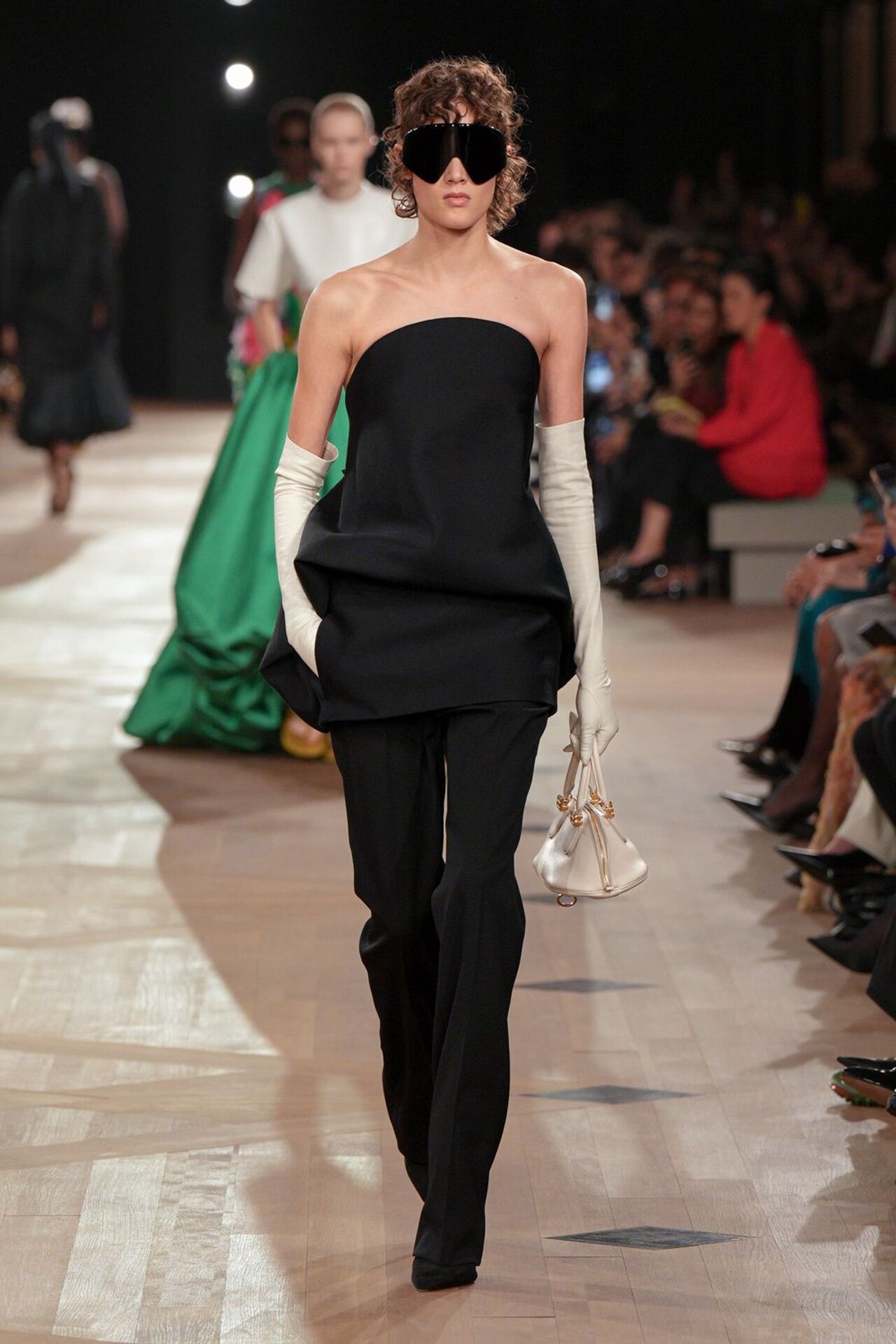 Prvi look — duga crna večernja haljina s V-izrezom, nošena uz bijele rukavice i goleme crne sunčane naočale — djelovao je kao istovremeno hommage, koliko i novi smjer. U tom looku ne samo da smo gledali Cristóbala Balenciagu, već i Picciolijeve druge prethodnike poput Nicolasa Ghesquièreja do avangardne estetike u posljednjih nekoliko godina.