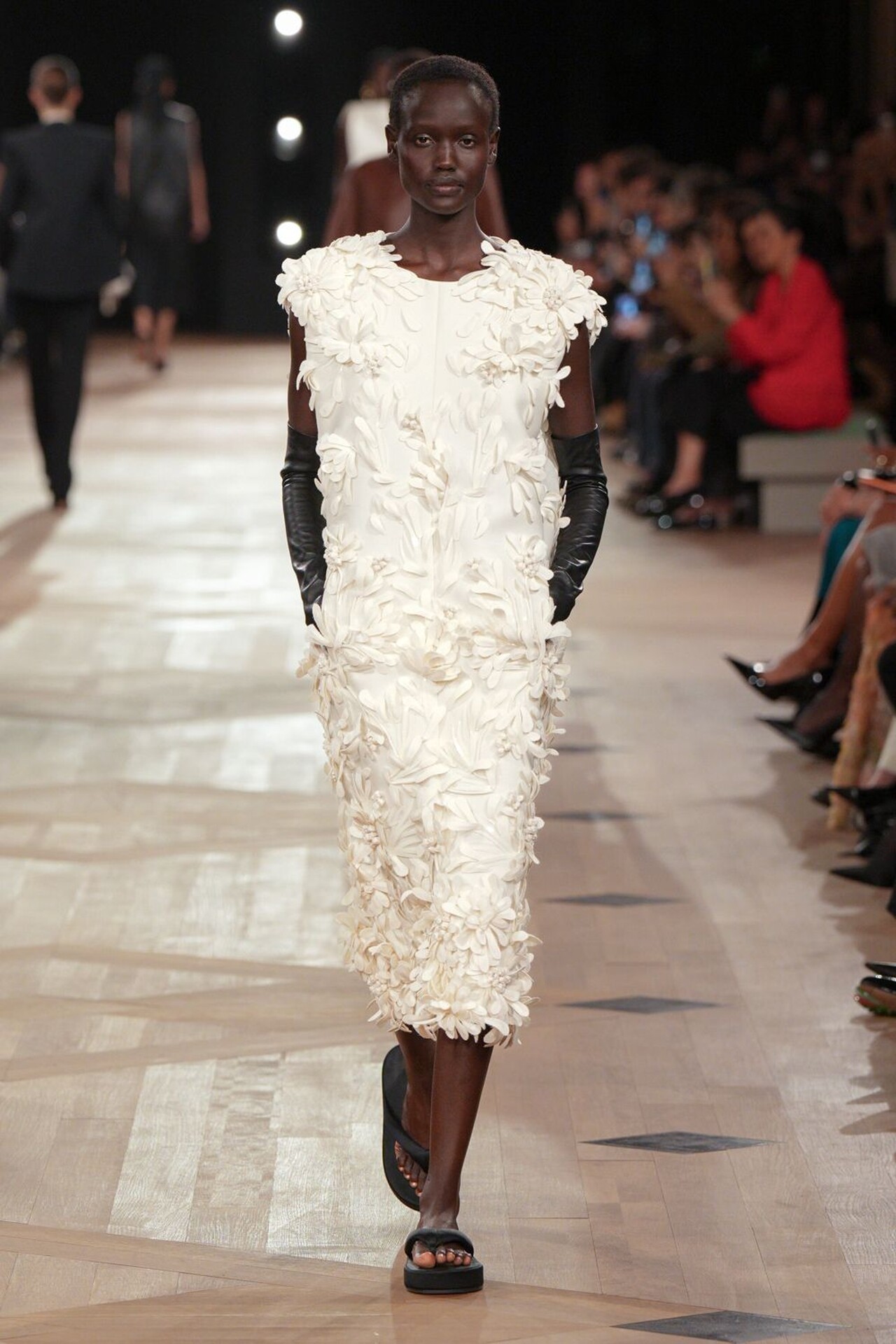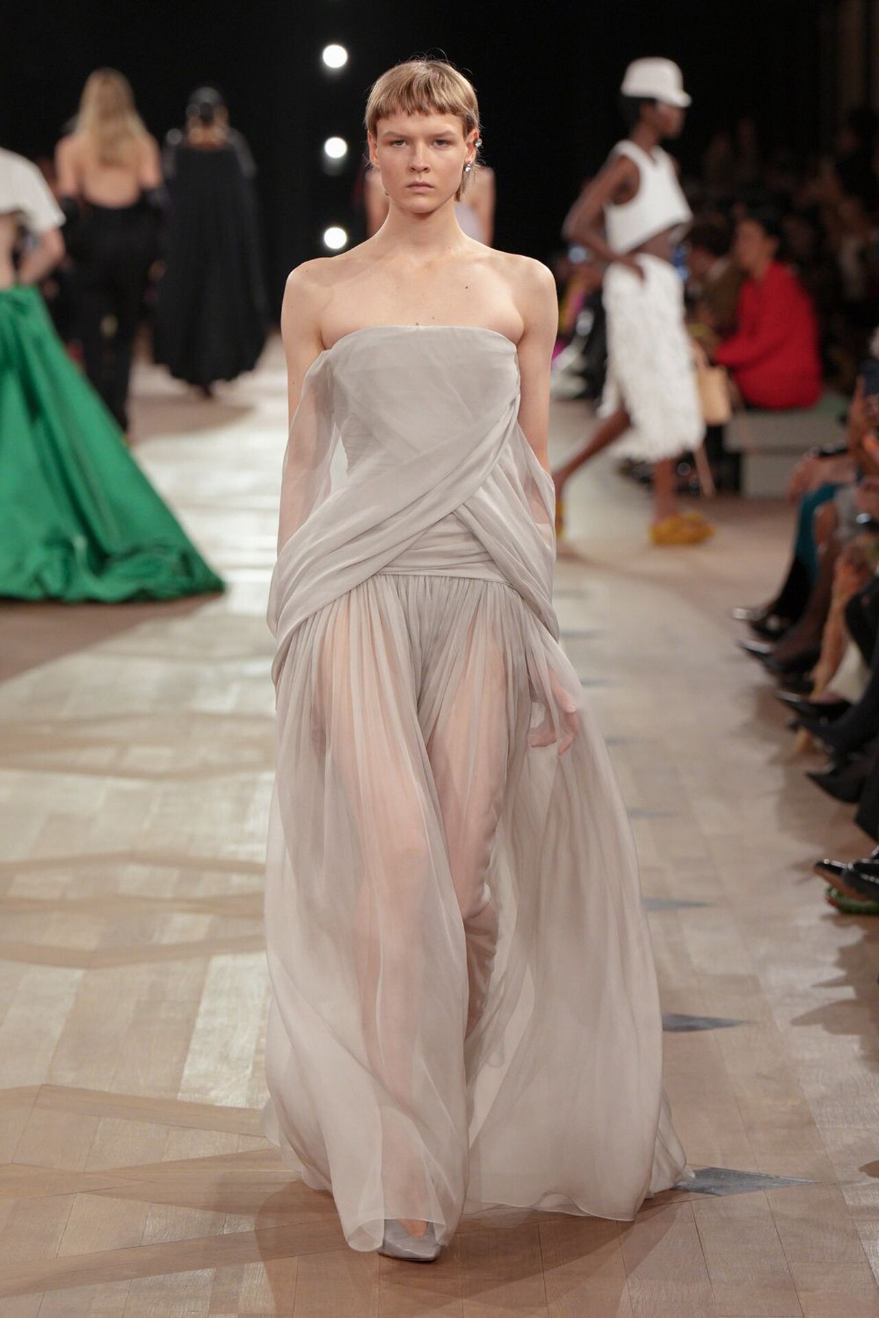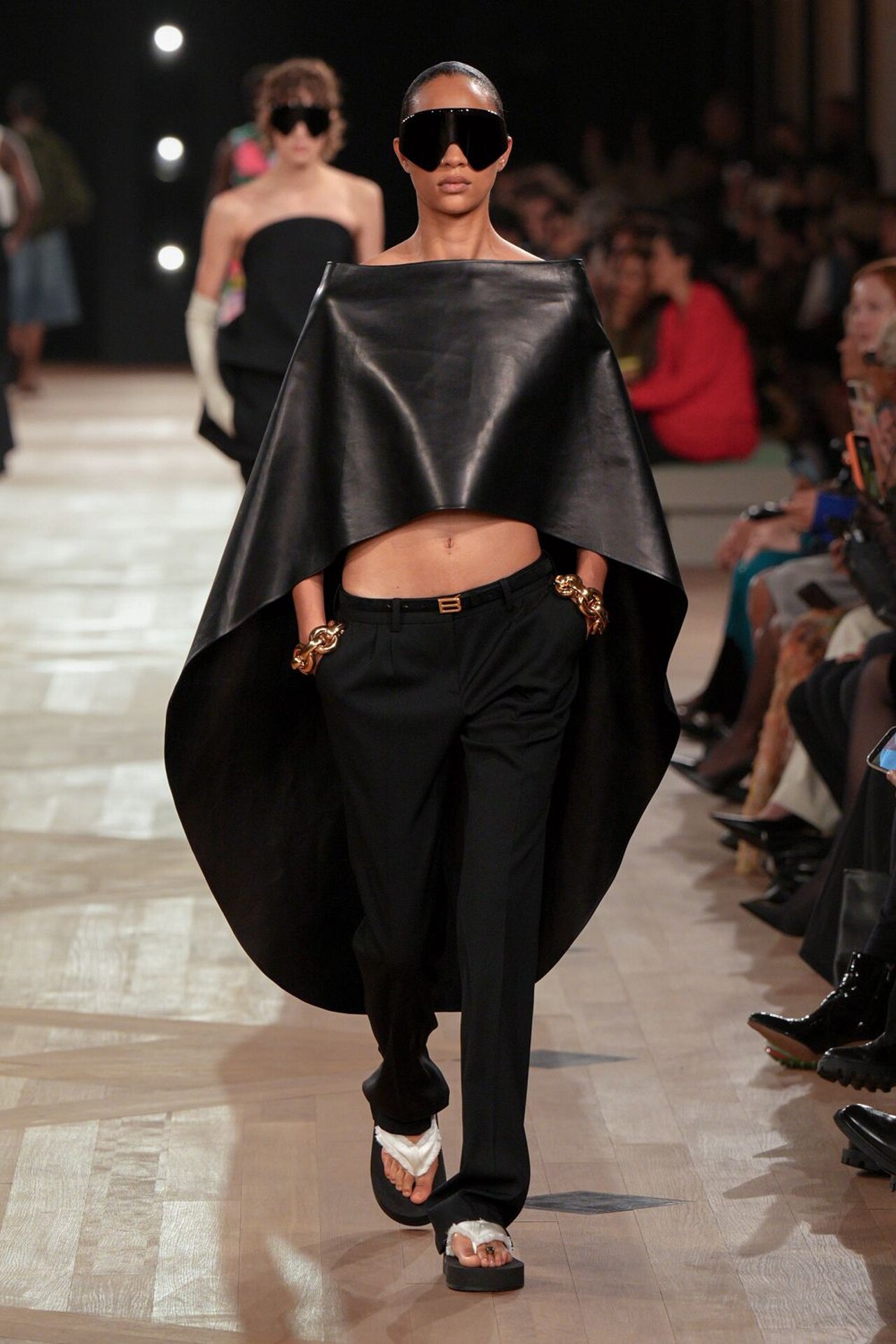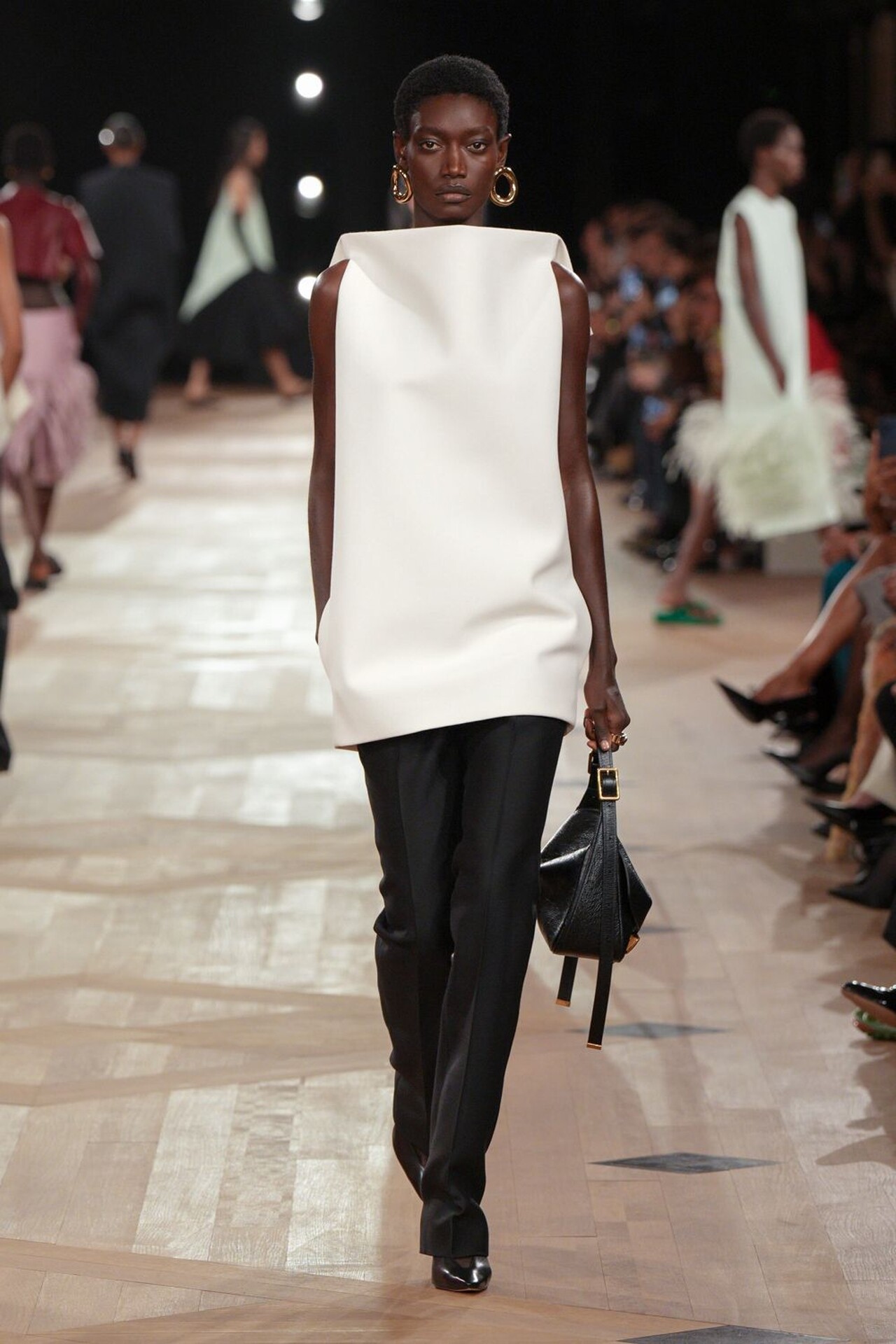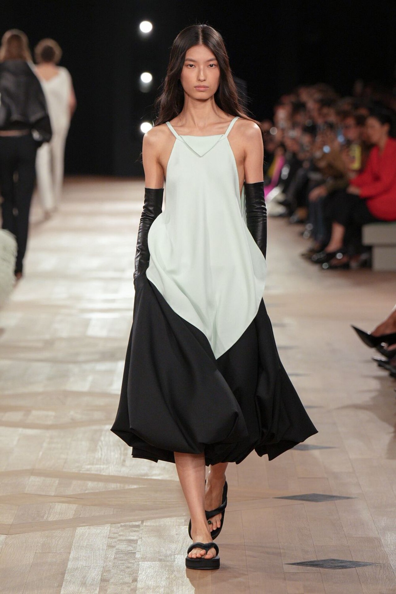 Prvi look — duga crna večernja haljina s V-izrezom, nošena uz bijele rukavice i goleme crne sunčane naočale — djelovao je kao istovremeno hommage, koliko i novi smjer. U tom looku ne samo da smo gledali Cristóbala Balenciagu, već i Picciolijeve druge prethodnike poput Nicolasa Ghesquièreja do avangardne estetike u posljednjih nekoliko godina.