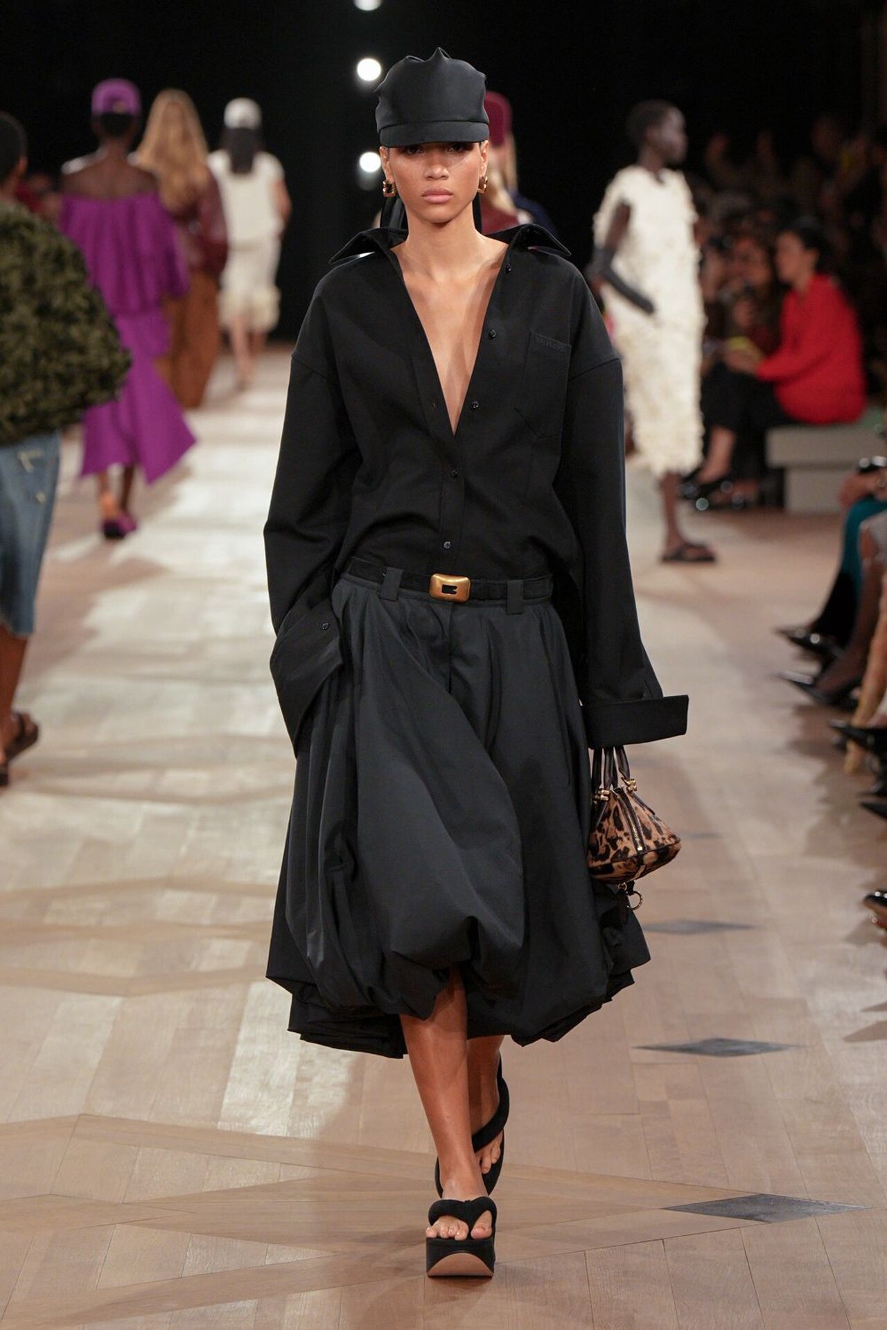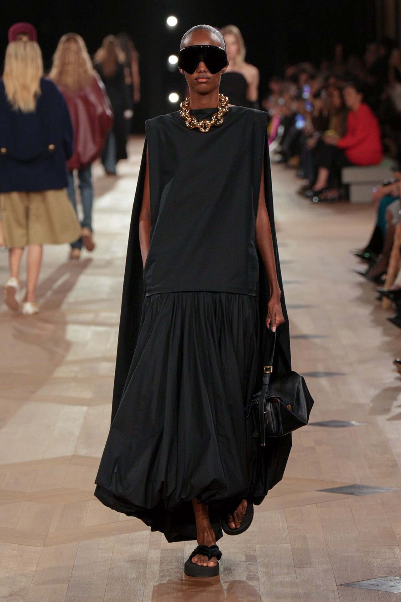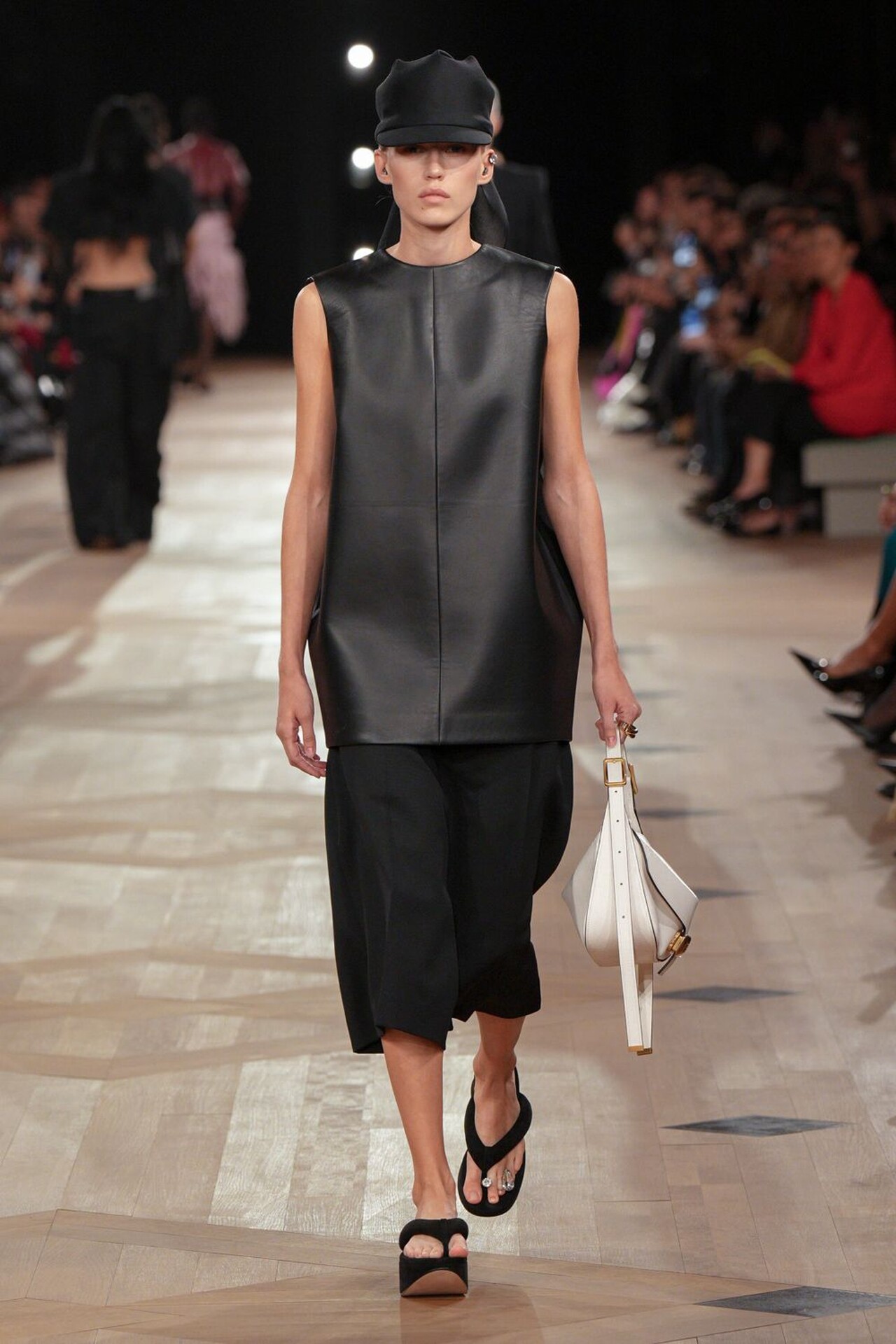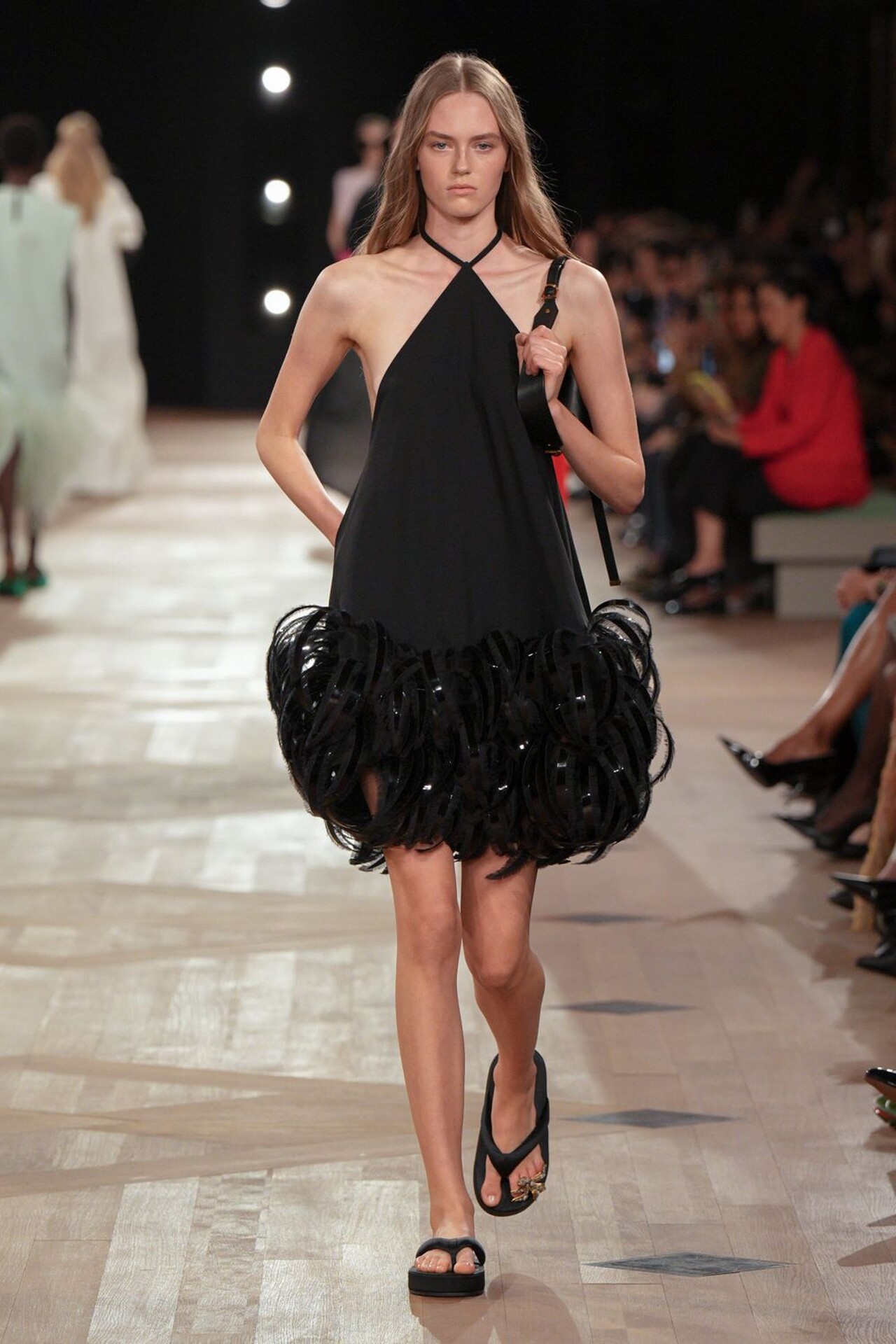 Prvi look — duga crna večernja haljina s V-izrezom, nošena uz bijele rukavice i goleme crne sunčane naočale — djelovao je kao istovremeno hommage, koliko i novi smjer. U tom looku ne samo da smo gledali Cristóbala Balenciagu, već i Picciolijeve druge prethodnike poput Nicolasa Ghesquièreja do avangardne estetike u posljednjih nekoliko godina.