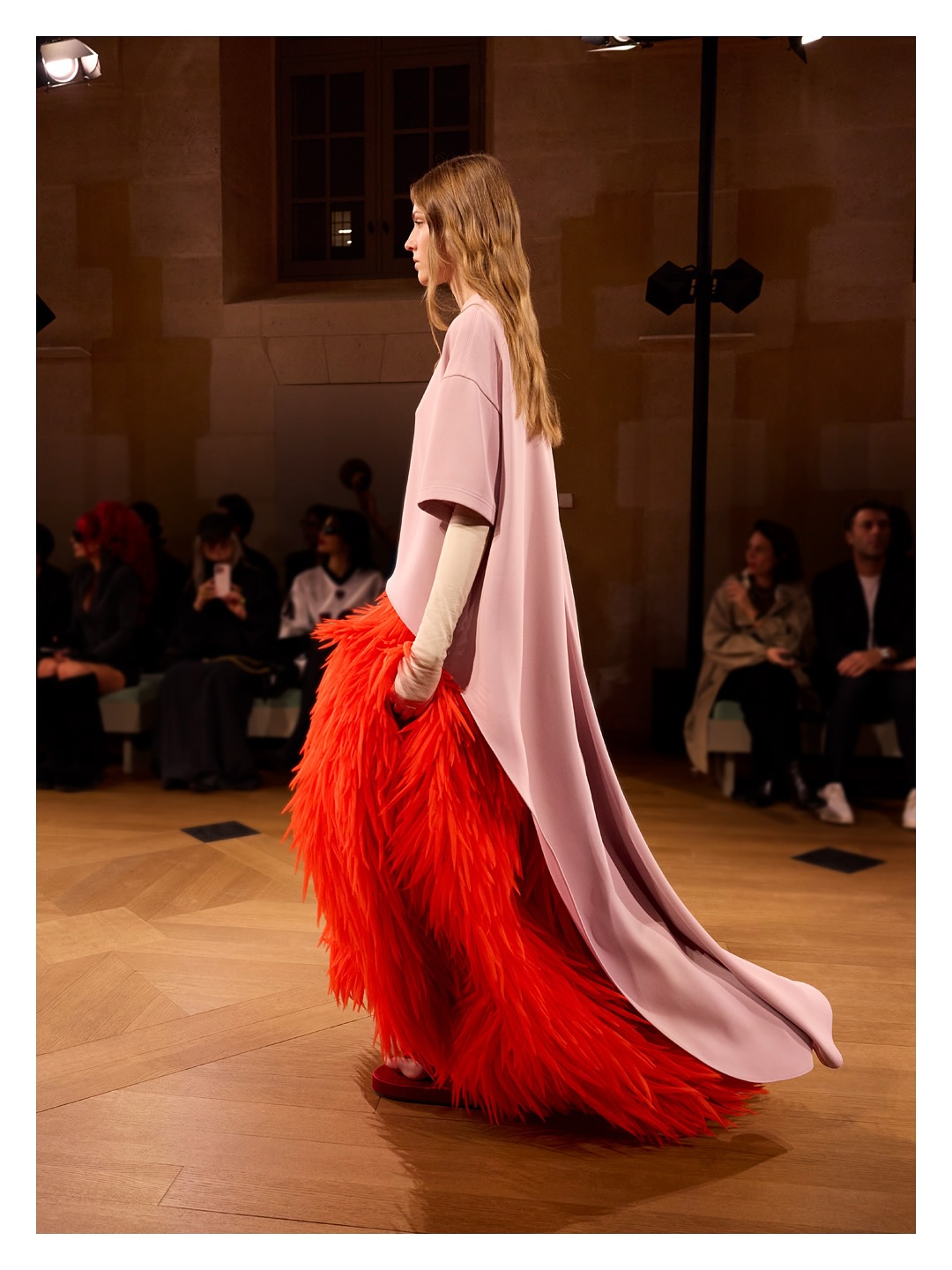 Piccioli je kreirao kolekciju uz jednu jasnu referencu; stvorio je modernije verzije haljine “Sack” Cristóbala Balenciage iz 1957. godine. Taj je model, nekad kritiziran zbog odbacivanja Diorovih silueta, postao metafora oslobođenja i dodao voluminoznost koja se do tad nije vezala uz ženstvenost u haljinama. Upravo je to bila osnova Picciolijeve Balenciage – precizni krojevi, skulpturalni krojevi i predimenzioniranost koja je neodoljivo ženstvena.