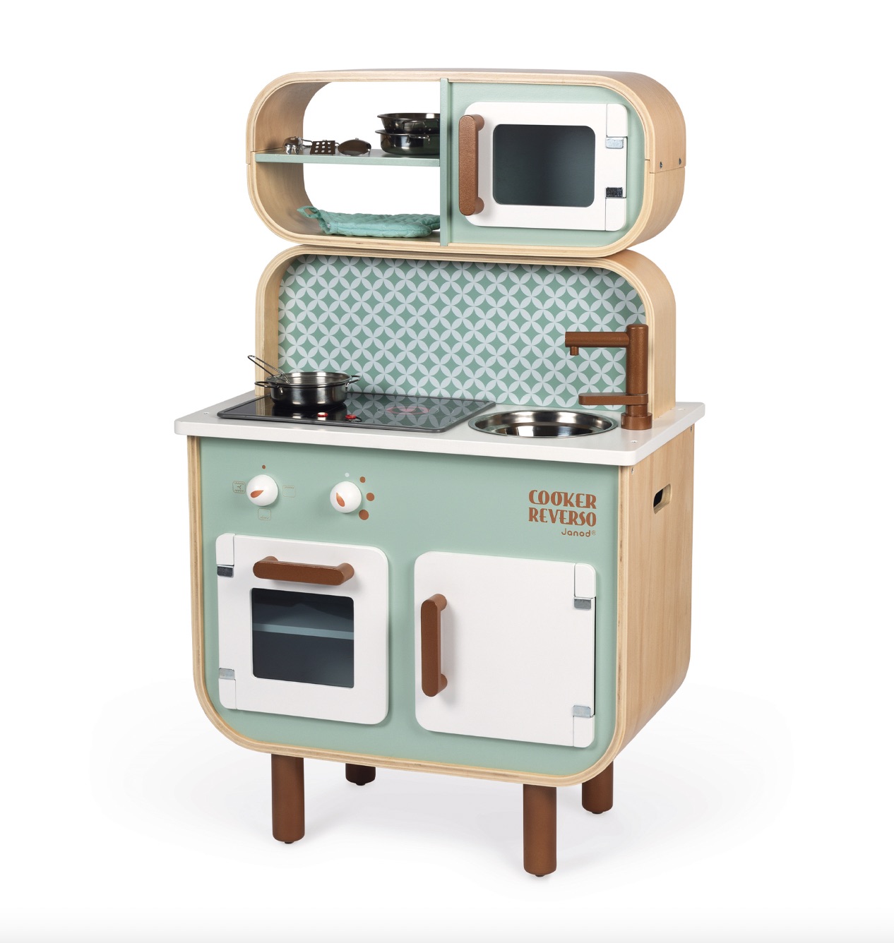 Kako na najbolji način razviti dječju kreativnost i dobre navike? Kroz igru! A upravo u tome pomaže ova drvena dvostrana kuhinja s vešerajem brenda Janod, dostupna za kupnju putem Lafaboo webshopa. S jedne strane nalazi se kuhinjica koja je opremljena baš kao prava, s mikrovalnom pećnicom, pećnicom, metalnim sudoperom, policama i pločom za kuhanje. Ploča za kuhanje svijetli i proizvodi zvuk – jednim pritiskom crvene tipke upalit će se svijetlo, a drugim pritiskom ploča će ispustiti zvuk vrenja vode. Zvuk i svjetlo se automatski isključuju nakon 30 sekundi ili kad se gumb pritisne treći put. Kako bi iskustvo vašeg malog chefa bilo potpuno, drvena kuhinjica opremljena je i metalnim dodacima – tavom, loncem, cjedilom, lopaticom, šefljom, žlicom s cjedilom, žlicom za tjesteninu i rukavicom.