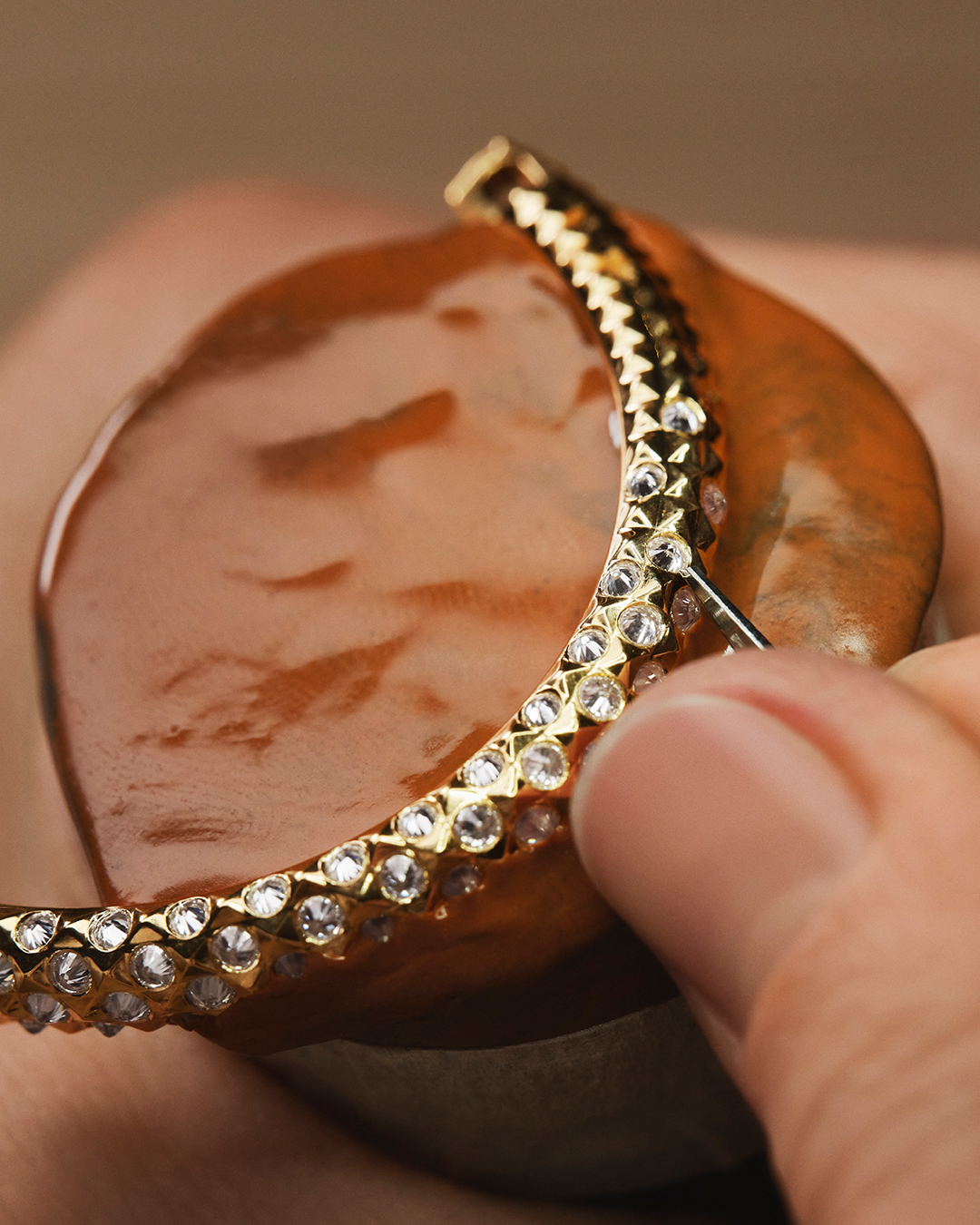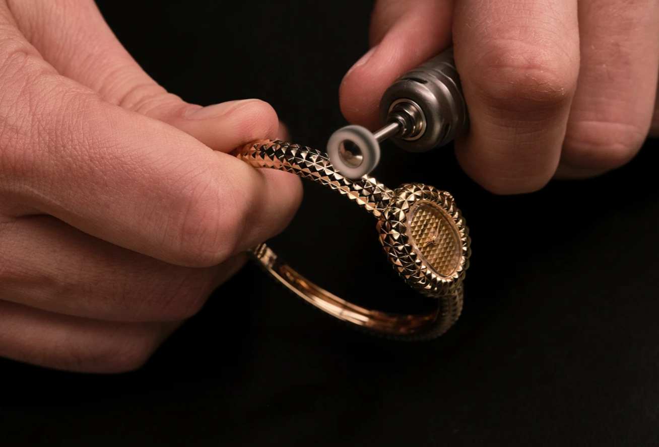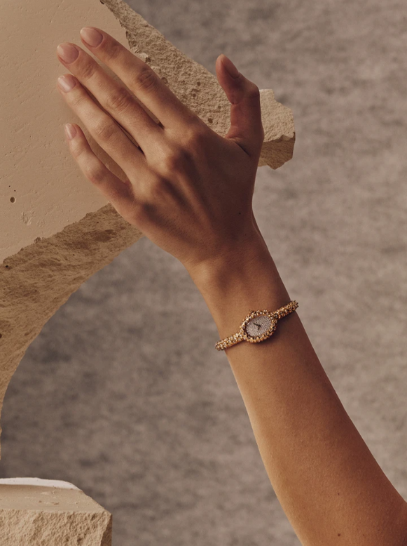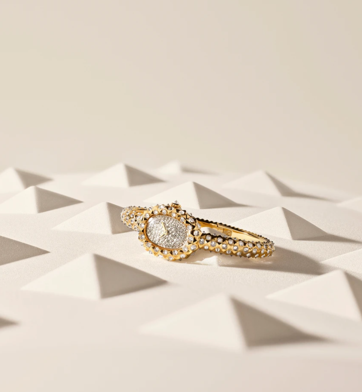 Ono što ovu novu verziju čini posebnom jest potpuno novo lice sata. Cijela površina – od ovalnog kućišta, preko brojčanika pa sve do narukvice – prekrivena je prepoznatljivim uzorkom brenda Clou de Paris. Riječ je o geometrijskom motivu sastavljenom od sitnih, ručno poliranih piramida koji u kontrastu s mekim, zaobljenim linijama sata stvara vizualno izuzetno zanimljiv efekt na zapešću. Upravo ta igra teksture i oblika daje satu novu dimenziju – izgleda poput komada nakita čiji se izgled mijenja ovisno o svjetlu.