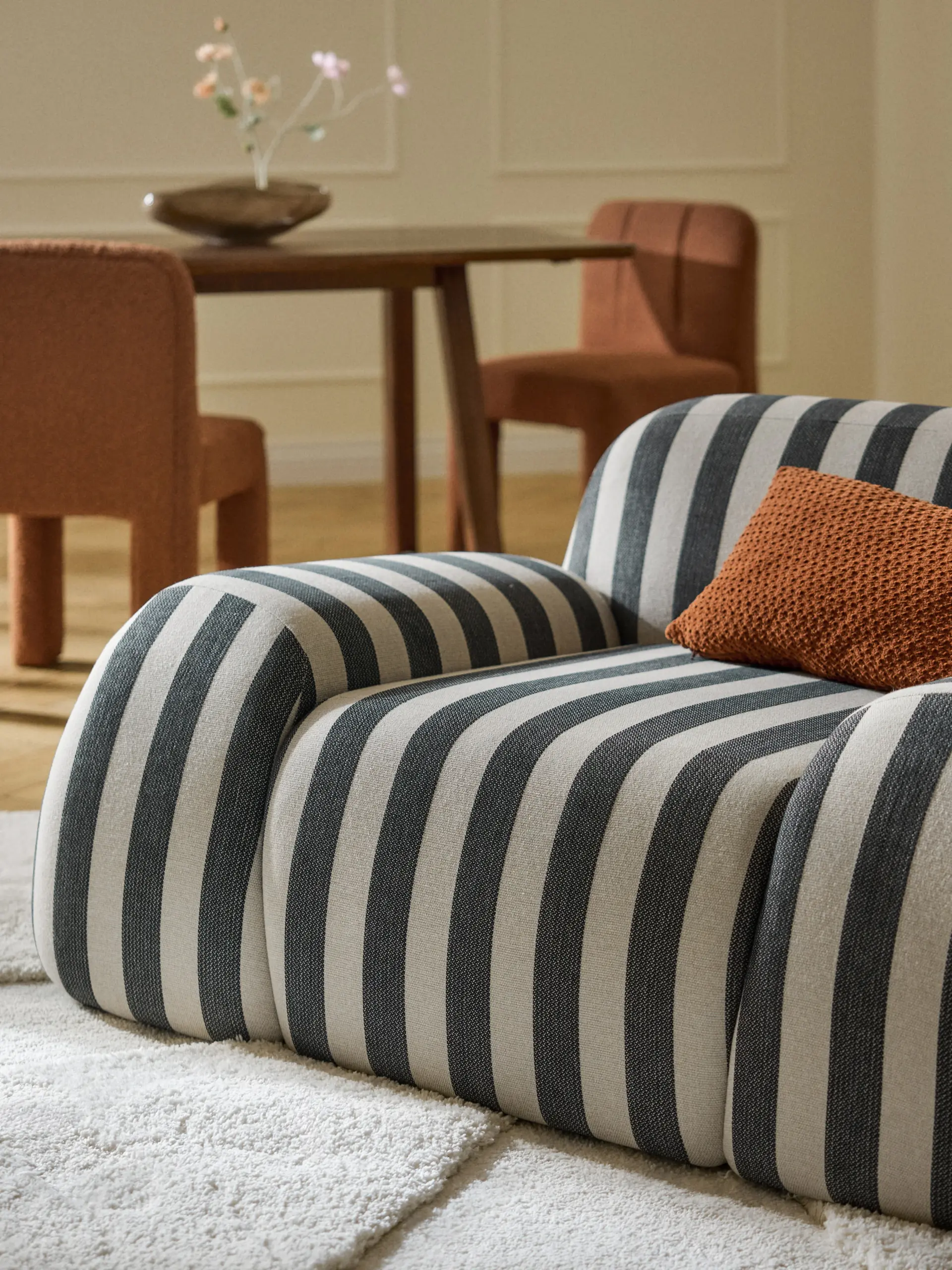 Izrađena od visokokvalitetne tkanine jednostavna je za održavanje, a nova prugasta presvlaka dodaje dozu svježine dizajnu, stvarajući još smjeliju vizualnu prisutnost.