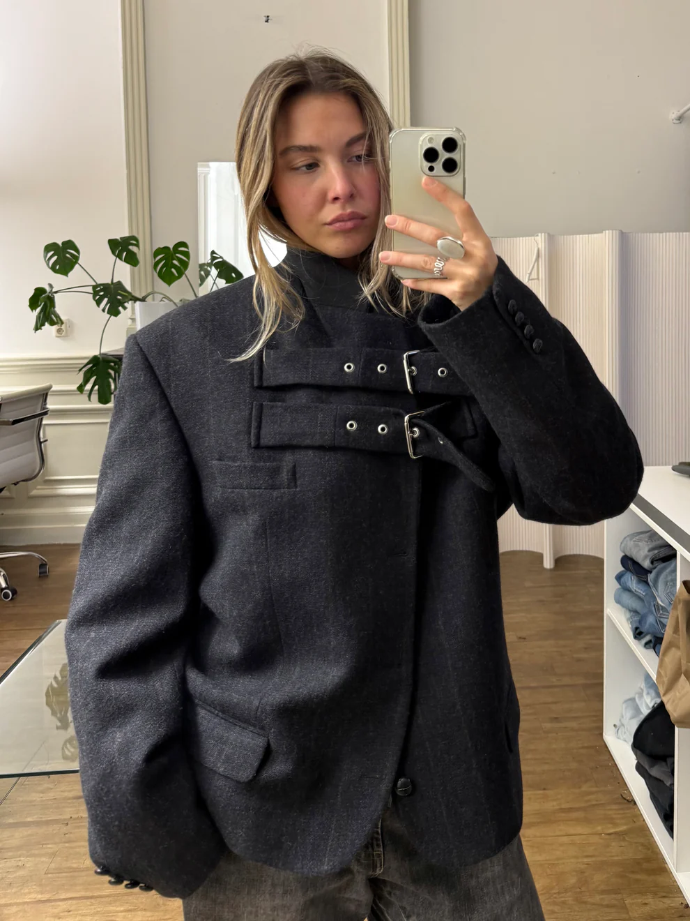Posebnu pažnju privlači njihov recreated blazer jakna, nastao rekonstrukcijom kvalitetnih vintage blejzera. Svaki komad dodatno je osmišljen uz podesive trake koje daju novu dimenziju silueti i omogućuju individualno prilagođavanje. Kroj je namjerno oversized, no precizno balansiran kako bi zadržao strukturu i eleganciju.