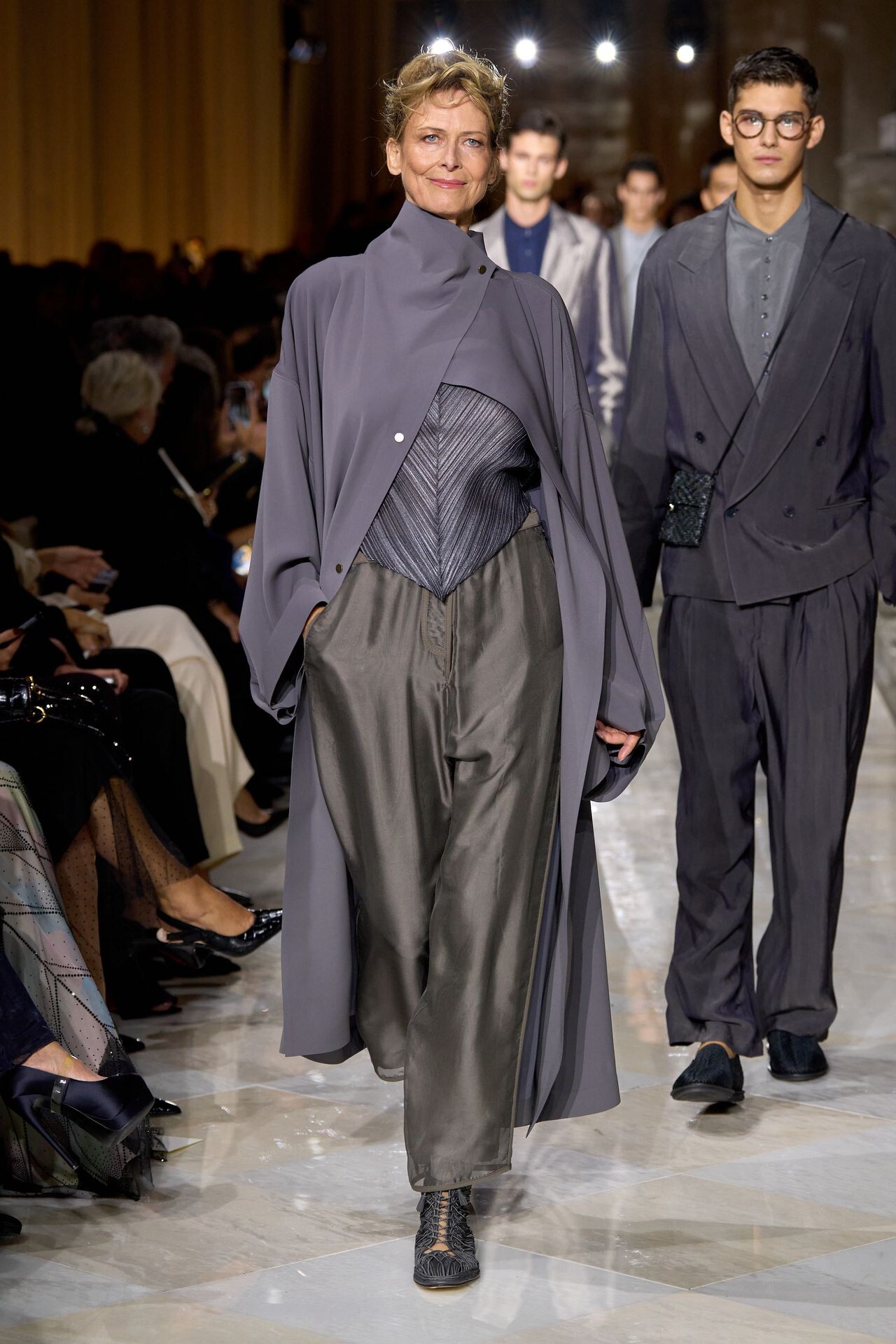 Kolekcijom su dominirale fluidne siluete i profinjene linije koju su oduvijek definirale kolekcije Giorgija Armanija. Paleta boja obuhvaćala je prirodne tonove sive i bež, pa sve do profinjenih tamno plavih nijansi. Revija je završila s izlaskom Agnes Zogle, dugogodišnje Armanijeve muze, u haljini na kojoj je kristalima bilo iscrtano dizajnerovo lice (a isti je portret bio na bijeloj majici koja je poslana gostima kao pozivnica).