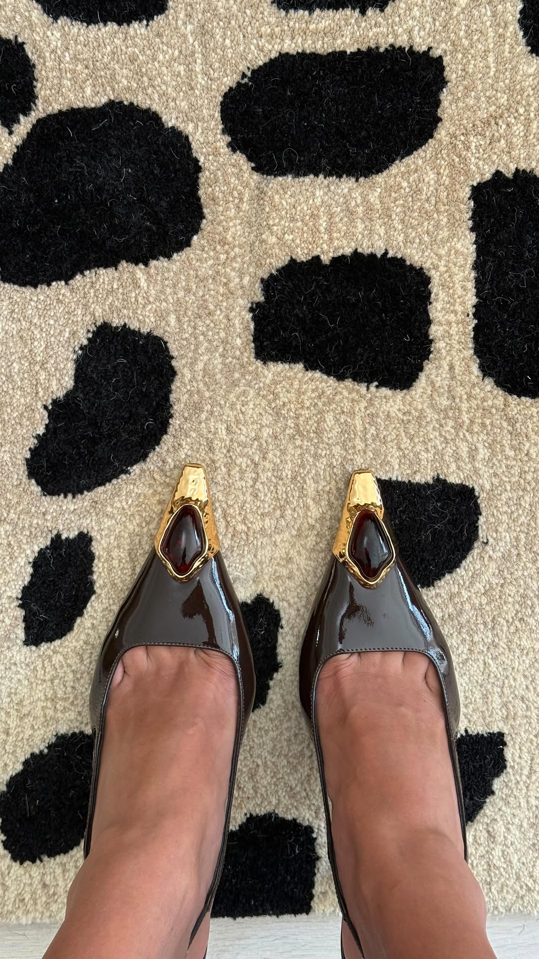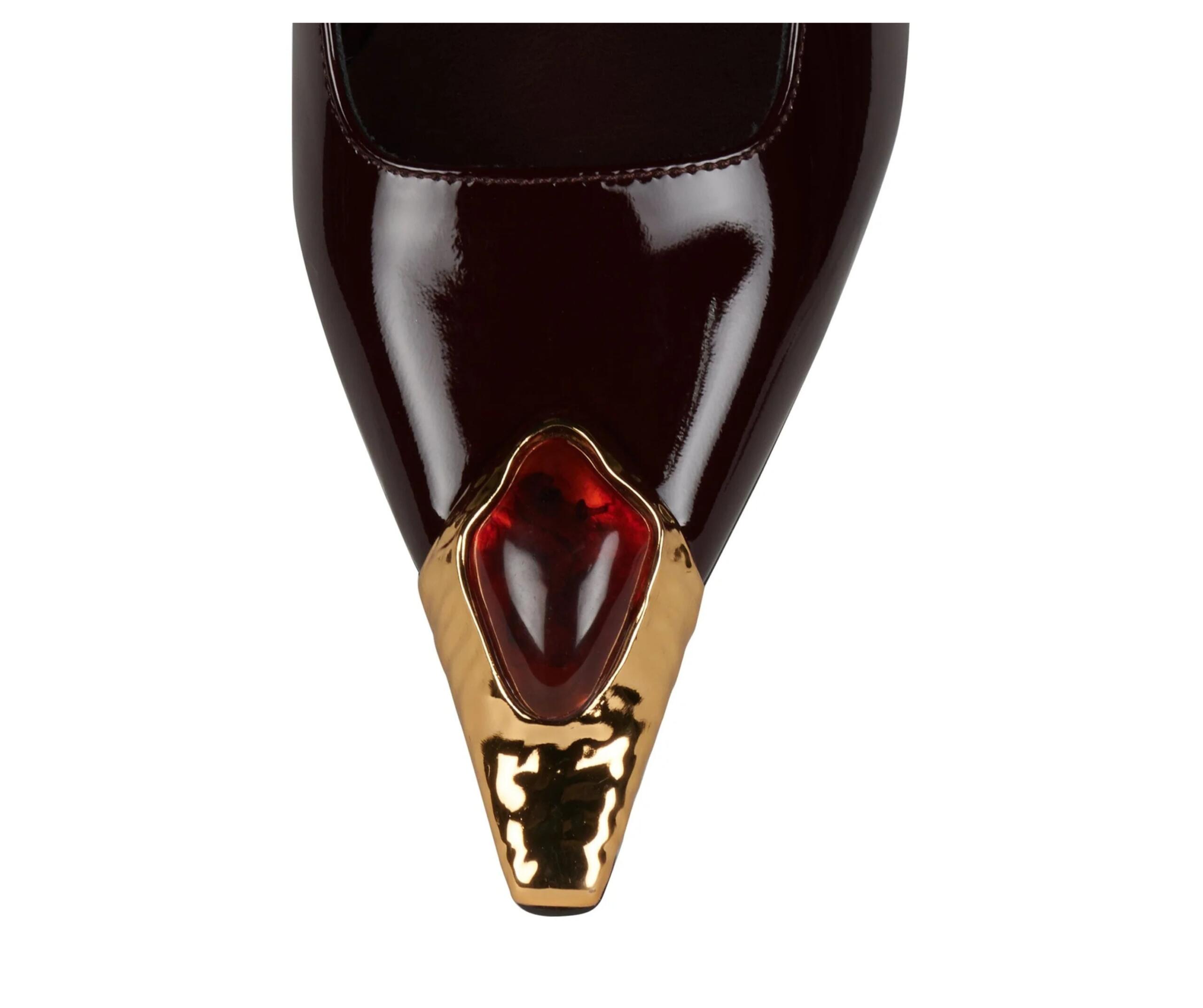 Visoki sjaj lakirane kože, dramatičan metalni špic zlatnog sjaja i ukrasni crveni kamen koji podsjeća na vintage nakit – svi ti detalji stvaraju dojam raskoši i mistike. Svaki detalj djeluje pažljivo osmišljen: od elegantnog remenčića koji vizualno izdužuje nogu do upečatljivog metalnog završetka koji bi mogao proći i kao skulpturalni dizajnerski element.