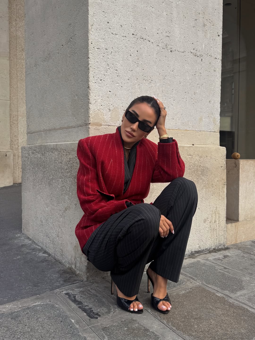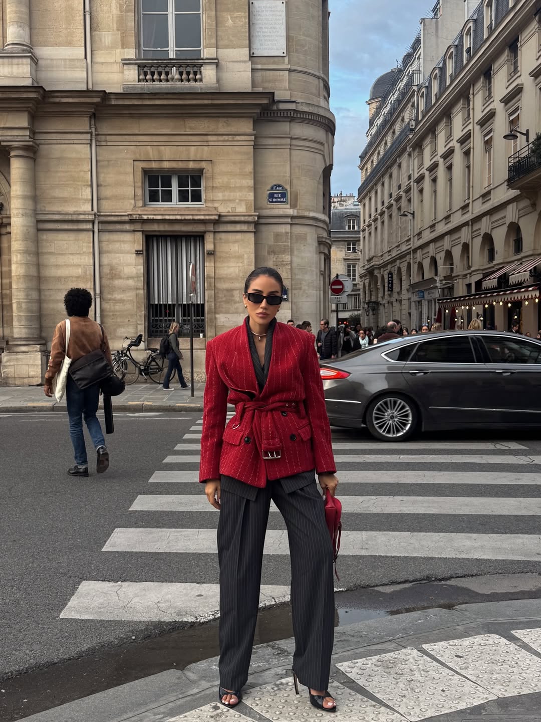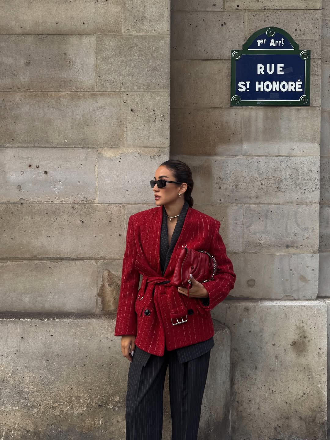 Riječ je o modelu koji savršeno spaja mušku siluetu i ženstvenu profinjenost, s prepoznatljivim oversized krojem, naglašenim ramenima i remenom koji stavlja fokus na struk. Kalinić je model iskombinirala s tamnim pinstripe hlačama širokih nogavica, kožnatom torbom u jarkocrvenoj nijansi, natikačama s potpeticom te minimalističkim nakitom i crnim sunčanim naočalama, stvarajući look koji odiše pariškim chicom.