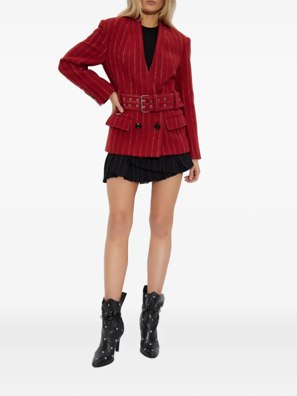 Ovaj sako utjelovljuje ono što čini brend Isabel Marant prepozantljivim i voljenim – nonšalantnu eleganciju s rokerskim štihom. Crvena boja i decentne pruge unose dozu elegancije, dok remen definira siluetu na način koji je istovremeno moderan i svevremenski.