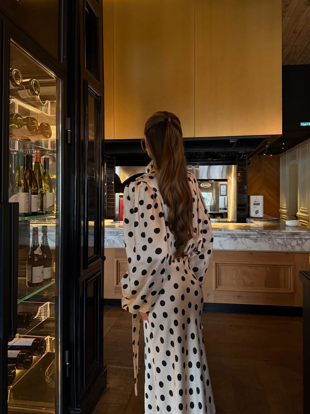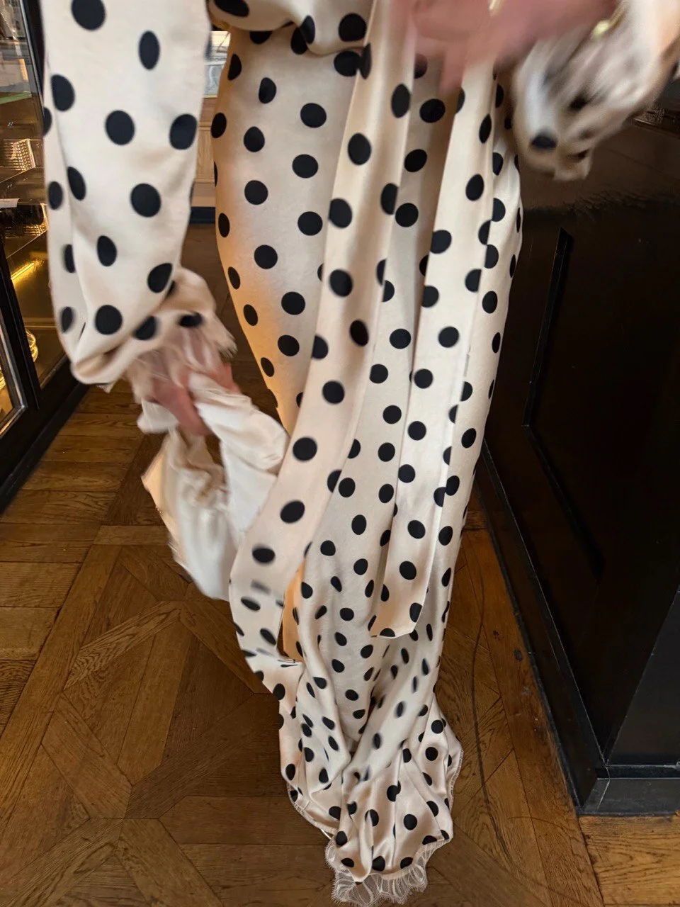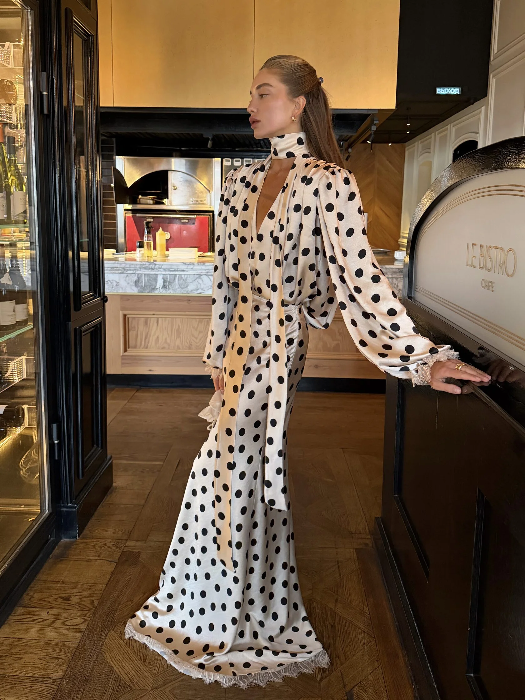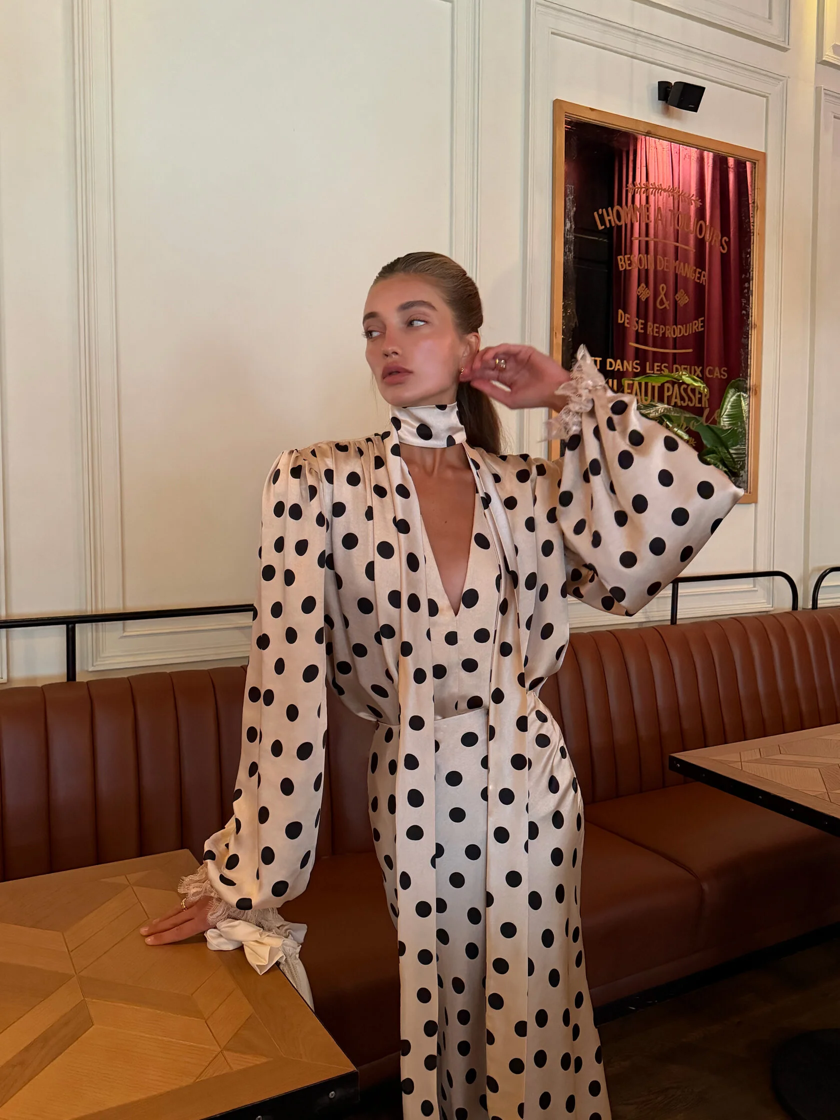 Na prvi pogled jasno je da se radi o kompletu koja ne prolazi nezapaženo. Bijela satenska tkanina prošarana klasičnim crnim točkama, elegantna silueta koja prati tijelo i suptilni detalji poput visokog ovratnika s maramom i voluminoznih rukava stvaraju dojam svevremenske ženstvenosti. Sve na ovom kompletu djeluje promišljeno, ali istovremeno nenametljivo chic.