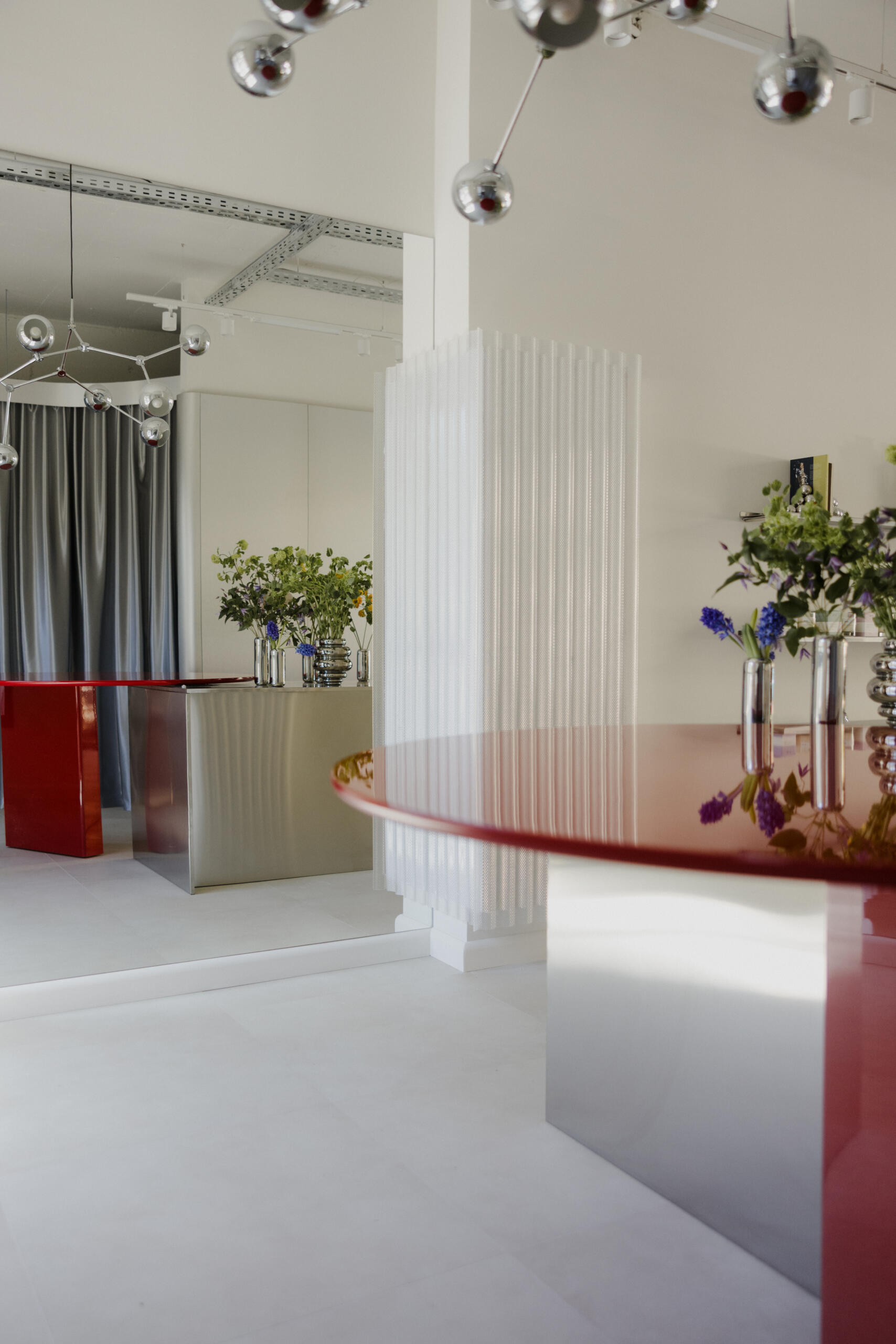 Organizacija interijera temelji se na otvorenoj, protočnoj cjelini s jasno definiranim zonama koje se prirodno nadovezuju jedna na drugu. Središnji element prostora čini linearna konzola koja funkcionira kao radna ploha i mjesto okupljanja, dok se u kontrastu pojavljuje skulpturalni stol u crvenom tonu, kao suptilan, ali snažan akcent. Zidne plohe definirane su ritmom zaobljenih vertikala i uvučenih niša, koje zajedno s integriranom rasvjetom stvaraju osjećaj dubine i slojevitosti.