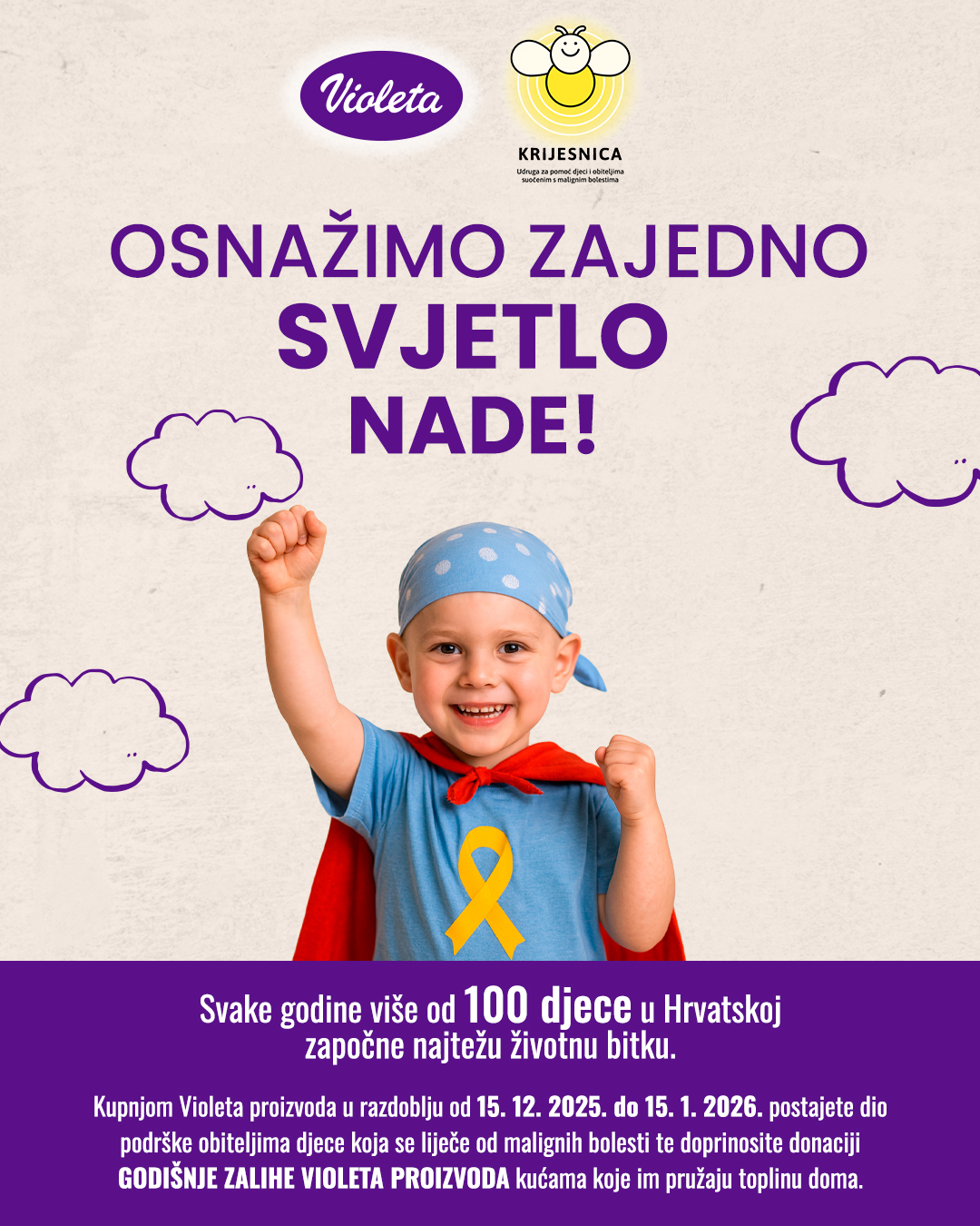 Ove godine to svjetlo postaje još snažnije – Violeta pokreće humanitarnu kampanju “Osnažimo zajedno svjetlo nade”, kako bi obiteljima koje privremeno žive u roditeljskim kućama pružili toplinu doma kroz donaciju godišnje zalihe proizvoda. Kupnjom Violeta proizvoda u razdoblju od 15. prosinca 2025. do 15. siječnja 2026. i vi postajete dio podrške obiteljima djece koja se liječe od malignih bolesti.