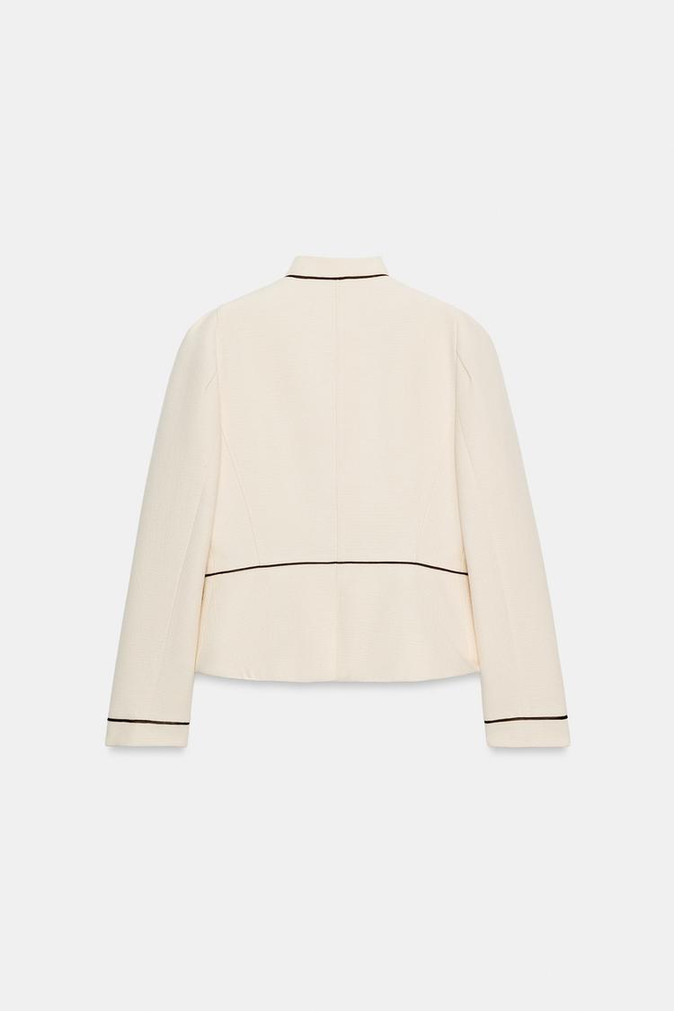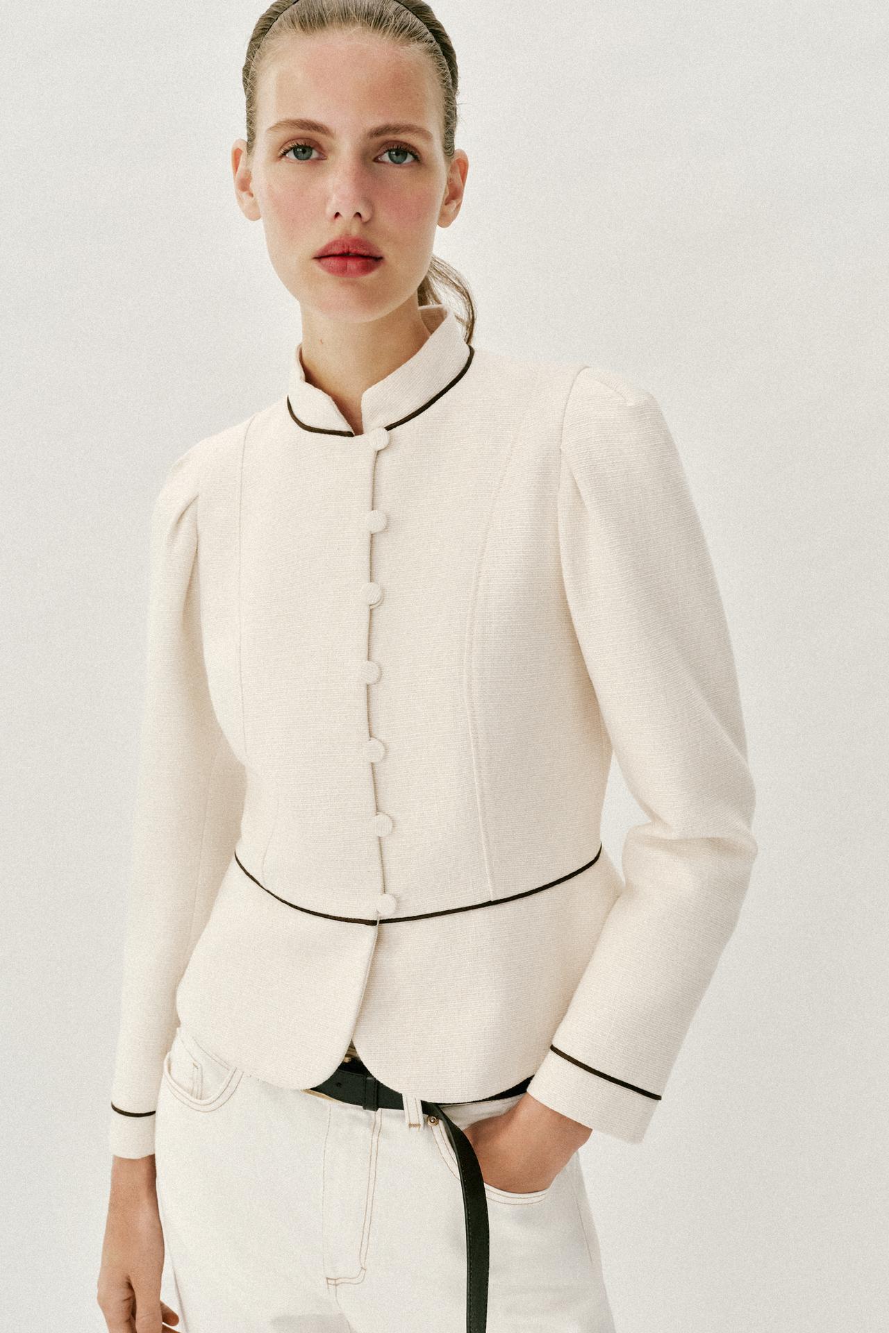 Sako ima visoki ovratnik i naglašena ramena, a njegova silueta prati liniju tijela i stavlja naglasak na struk. I dok je prošli hit model bio izrađen u upečatljivoj narančastoj nijansi s debljim kontrastnim detaljima, ovog puta model je kreiran od teksturirane tkanine u prljavobijeloj nijansi s tankim tamnosmeđim kontrastnim detaljima. To što je model izrađen u neutralnim nijansama, nimalo mu ne oduzima od atraktivnosti, a njegovom elegantnom izgledu – osim siluete – pridonose i gumbići koji su prekriveni istom tkaninom.